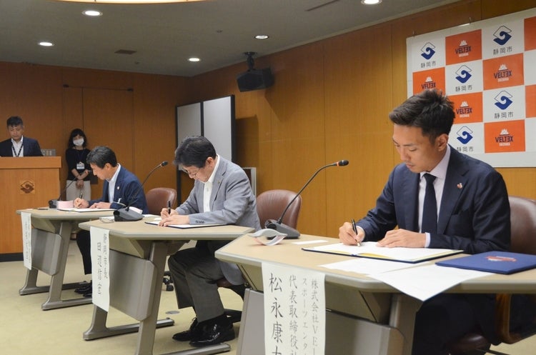 7月29日(火)静岡市役所にて三者協定締結式を執り行い、田辺信宏 静岡市長、赤堀文宣 静岡市教育委員会教育長、㈱VELTEXスポーツエンタープライズ 松永康太 代表取締役社長、ベルテックス静岡 #92 村越圭佑選手が出席いたしました。