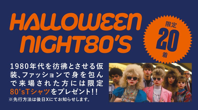 1980年代を彷彿とさせる仮装、ファッションで身を包んで来場された方には20着限定で80ʼsTシャツをプレゼント!!