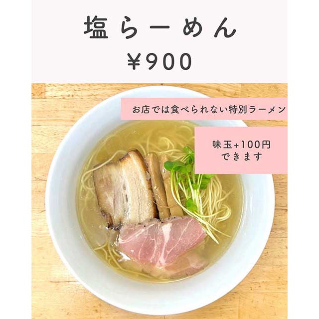 塩ラーメン:900円/辛味塩ラーメン:900円/チャーシュー丼:900円/餃子:500円/おつまみセット:500円、他