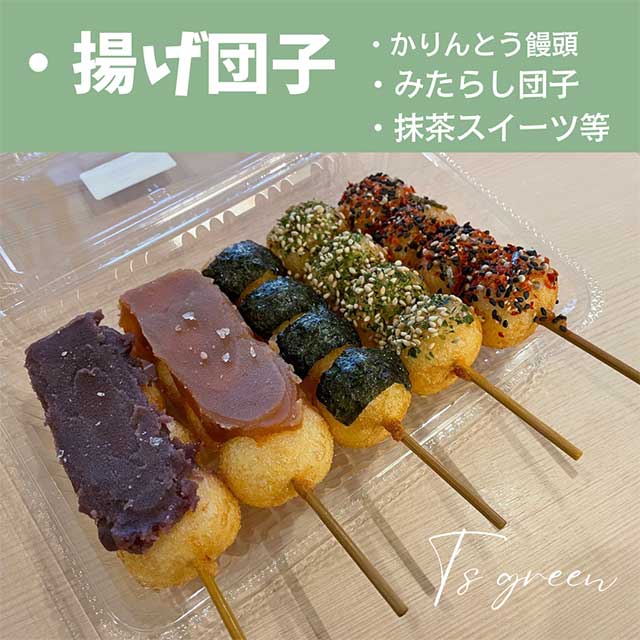 揚げ団子5本セット:1,080円/揚げ団子単品(1本):250円(塩あんこ、塩キャラメル、いそべ、ごまと静岡茶、えごま唐辛子)/かりんとう饅頭:150円/みたらし団子カップ: 350円/草団子カップ:350円