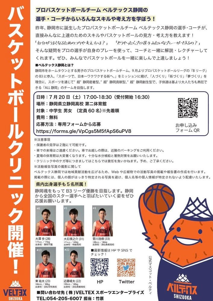 この度、VELTEX静岡は、バスケットボールクリニックを開催します。