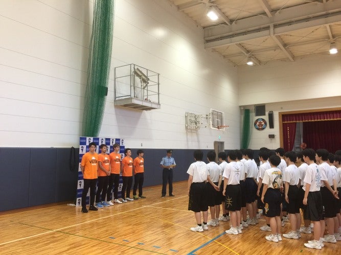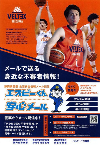 この度、VELTEX静岡は、静岡南警察署、静岡中央警察署、清水警察署、静岡南防犯協会、静岡中央防犯協会、清水防犯協会の皆さんとともに、「地域防犯」活動の一環として、常葉大学附属常葉中学・高等学校(静岡市葵区)女子バスケットボール部を訪問し、防犯キャンペーン、「エスピーくん安心メール」の普及活動を行いました。