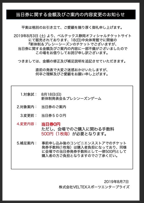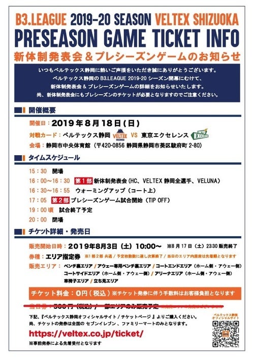 2019年8月18日(日)東京EXとのプレシーズンゲーム、VELTEX静岡新体制発表会チケット予約開始日のお知らせ
