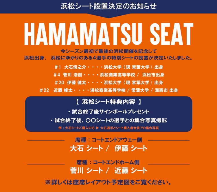 今シーズン最初で最後の浜松開催を記念して浜松出身、浜松にゆかりのある4選手の特別シートの設置が決定いたしました。