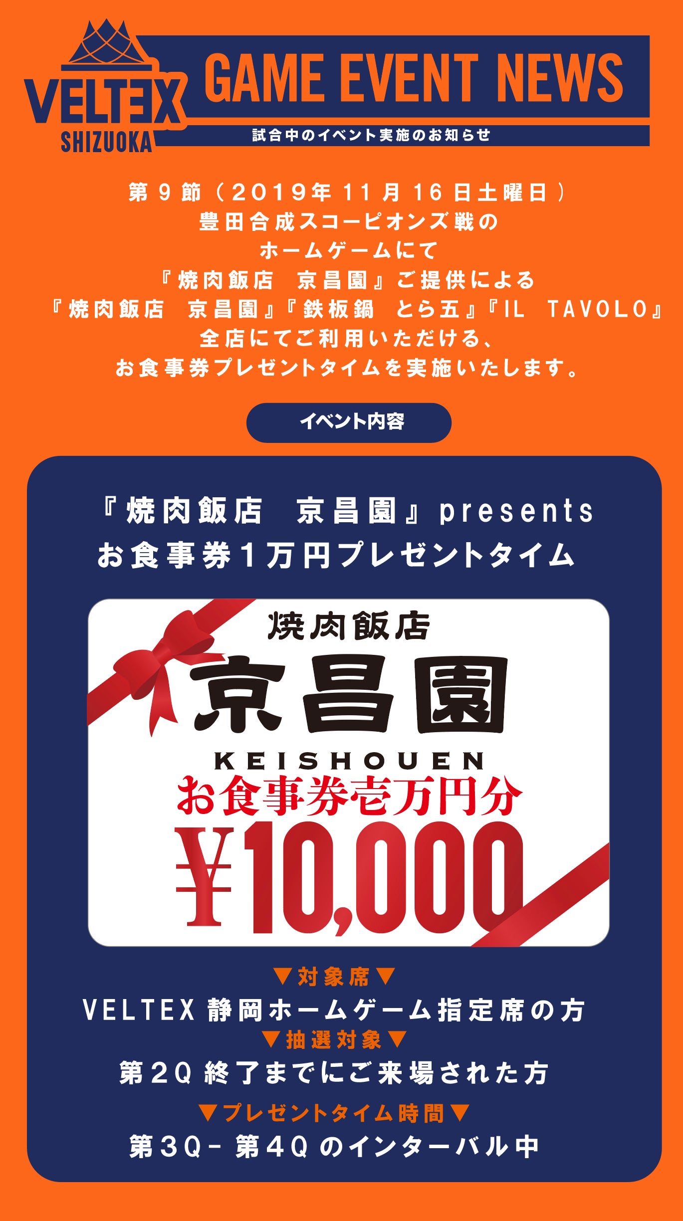 VELTEX静岡では、この度、【第9節】2019年11月16日(土)、豊田合成スコーピオンズ戦(清水総合運動場体育館)より、 ホームゲームが対象の「焼肉飯店 京昌園 presents お食事券1万円分プレゼント」企画を毎試合実施、開始します。