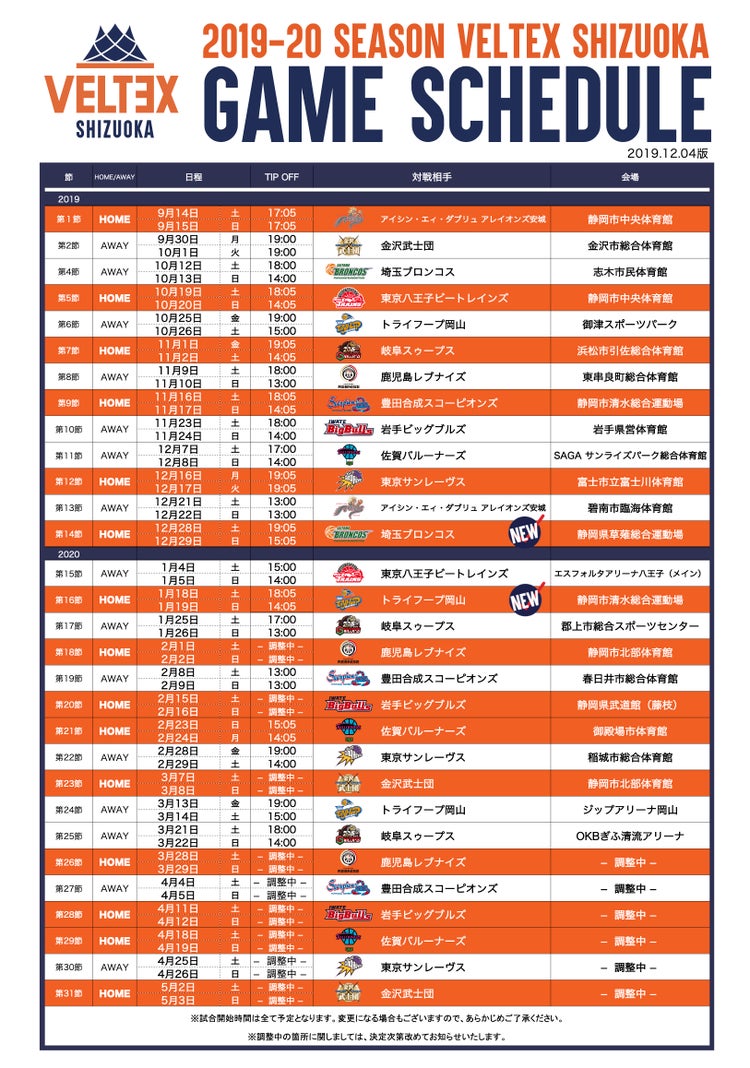 2019-20シーズン【第14節】【第16節】HOME 試合時間決定のお知らせとスケジュール更新