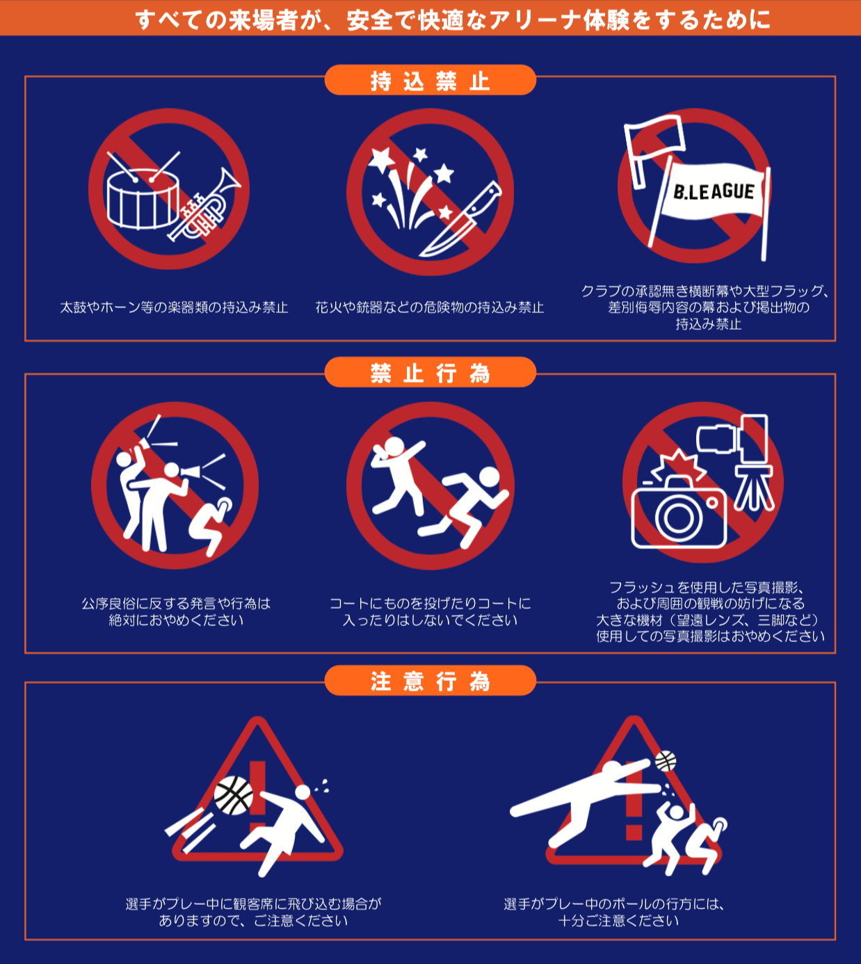 一律に、安全で、快適な試合観戦環境を提供するため、当観戦マナー&ルールを策定いたしました。 初めてアリーナに足を運んでいただく皆さまも、またこれまでもアリーナで観戦・応援を愉しんでいただいている皆さまも、素晴らしいアリーナ体験をお持ち帰りいただくために、すべての皆さまのご協力をお願いいたします。