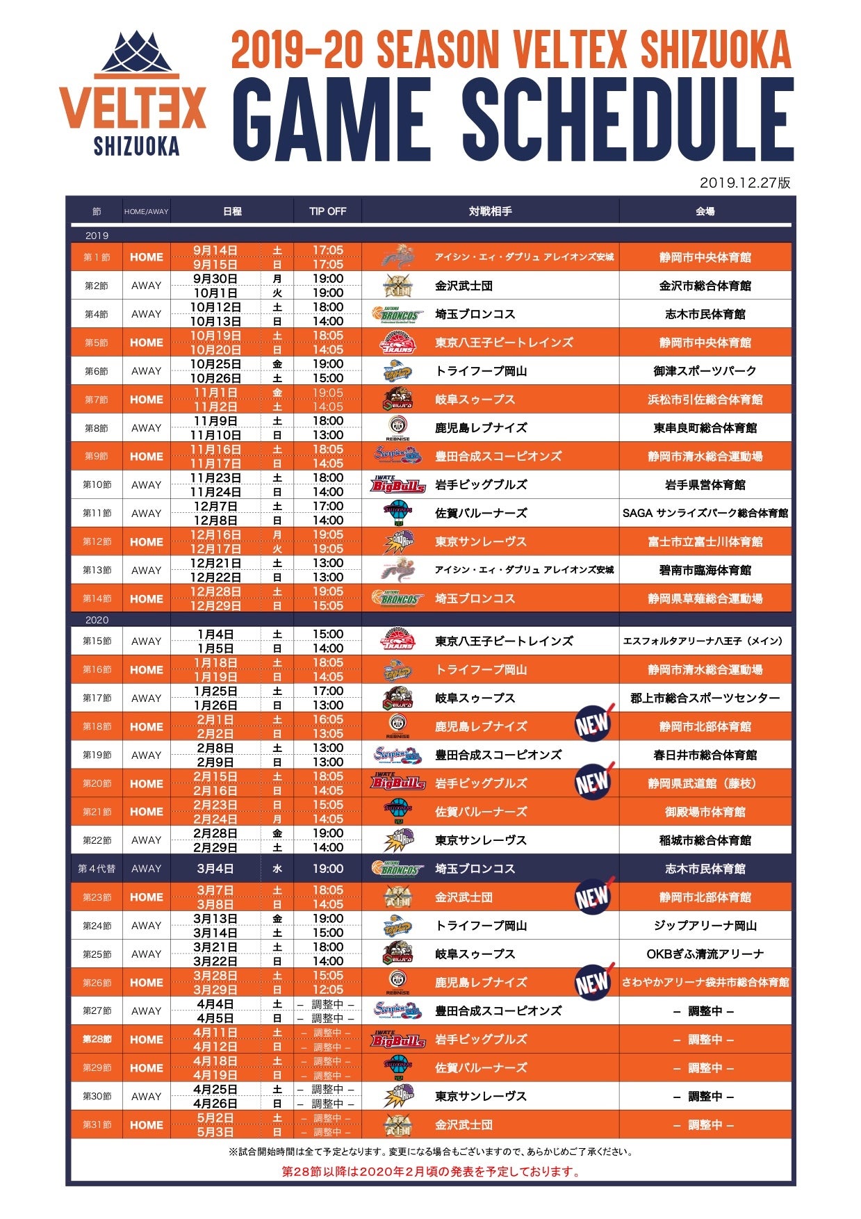 2019-20シーズン【第18節】【第20節】【第23節】【第26節】HOME 試合時間決定のお知らせとスケジュール更新