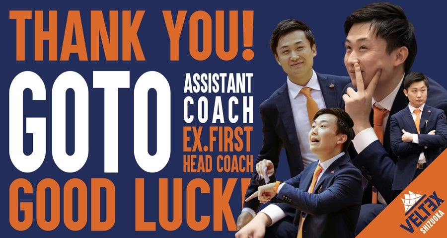 VELTEX静岡立ち上げから、これまで共に戦ってくれた後藤祥太アシスタントコーチには心より感謝すると共に、今後の更なる活躍を祈っております。