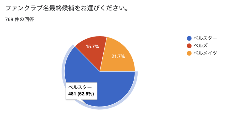 最終3候補の中から選ばれた名前はベルスター。この名前は、769票中、481票獲得いたしました。