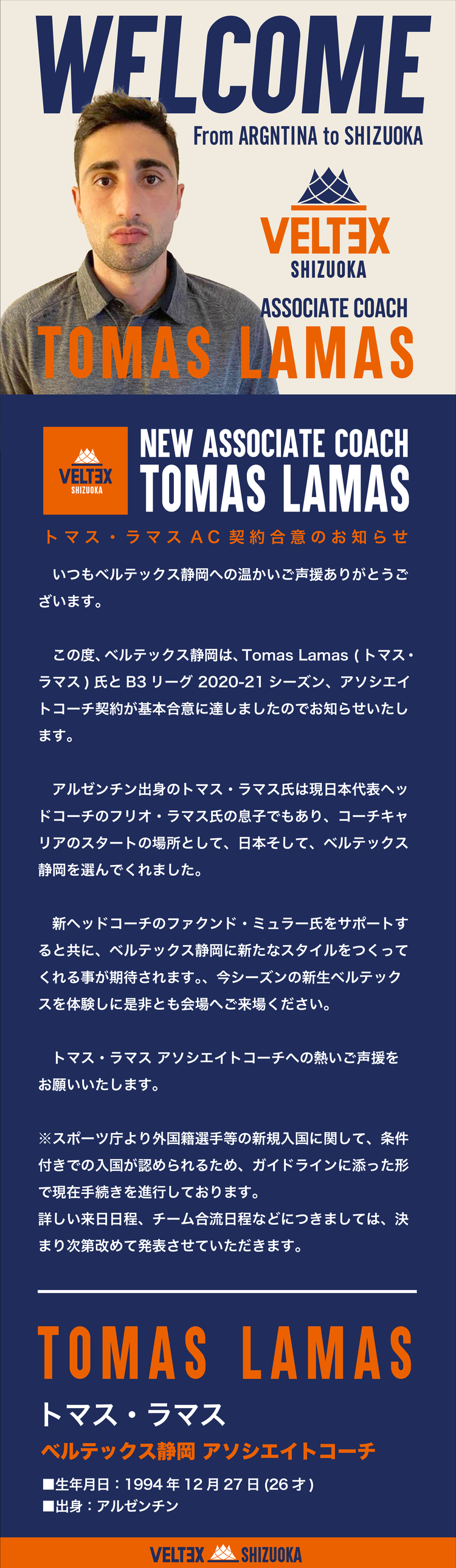 VELTEX Shizuoka would like to inform that we have signed a contract with Tomas Lamas as associate coach.He is son of Julio Lamas, head coach of the current Japan national team.