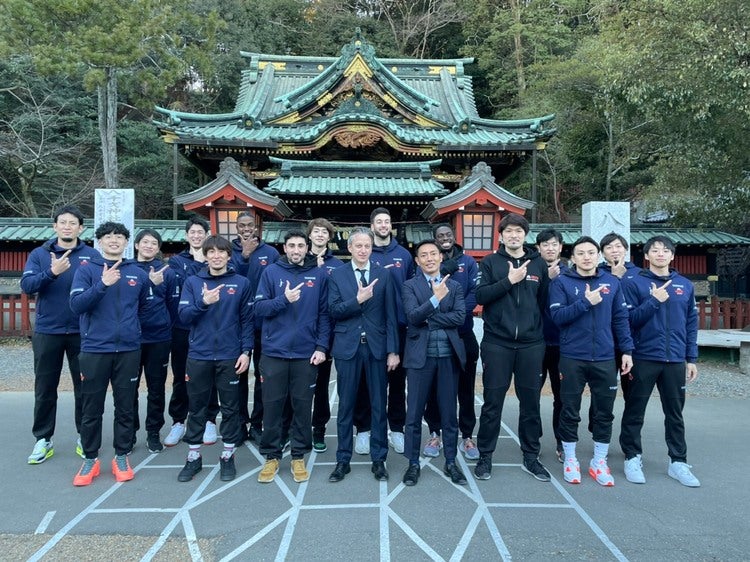 当日は、ベルテックス静岡 代表取締役 松永康太氏、ヘッドコーチ ファクンド・ミュラー氏をはじめ、選手13名が参加し、今シーズンクラブの目標として掲げている「B3リーグ優勝」を祈願しました。