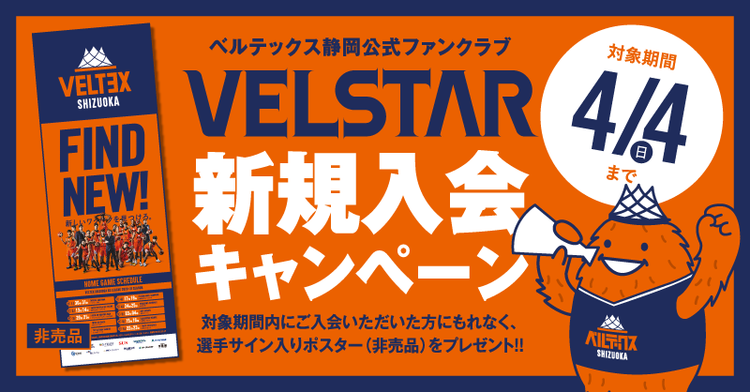 ベルテックス静岡では、ファンクラブVELSTARの新規入会キャンペーンを実施いたします。