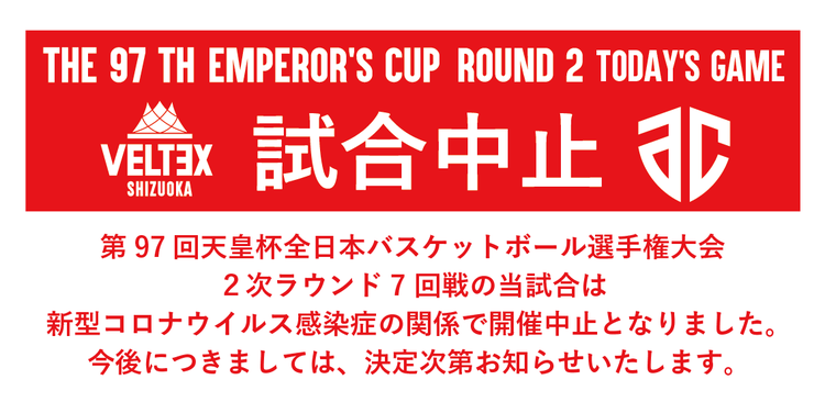 「第 97 回天皇杯 全日本バスケットボール選手権大会」 (主催:公益財団法人日 本バスケットボール協会 / 共催:共同通信社および共同通信加盟新聞社) の2次ラウンドにて、本日 9 月 23 日 (木・祝) に、7 回戦として対戦を予定しておりました第 1 試合 (ベルテックス静岡 vs. アル ティーリ千葉 つきまして、下記の理由により主催者判断にて中止となりましたので、 お知らせいたします。