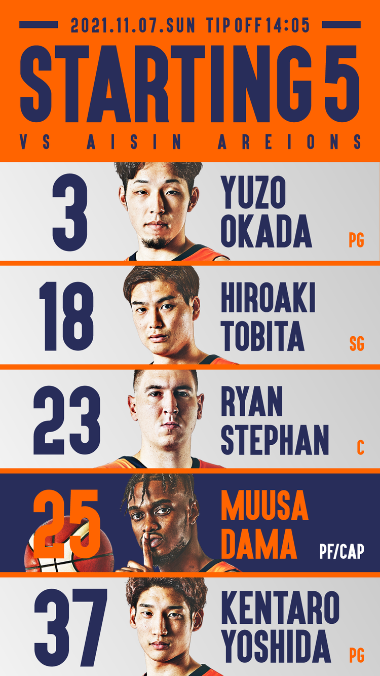 #3 岡田雄三、#18 飛田浩明、#23 ライアン・ステファン、#25 ムッサ・ダマ、#37 吉田健太郎