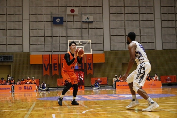 第1クォーター。試合開始直後ベルテックス#23ライアンが先制点を決めると、続く#18飛田がドライブで相手の外国籍選手を引き付けアシスト、そのパスに#25ムッサが走り込んで合わせ豪快なダンクシュートを放った。