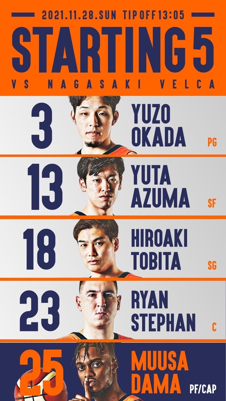 #3 岡田雄三、#13 東祐太、#18 飛田浩明、#23 ライアン・ステファン、#25 ムッサ・ダマ