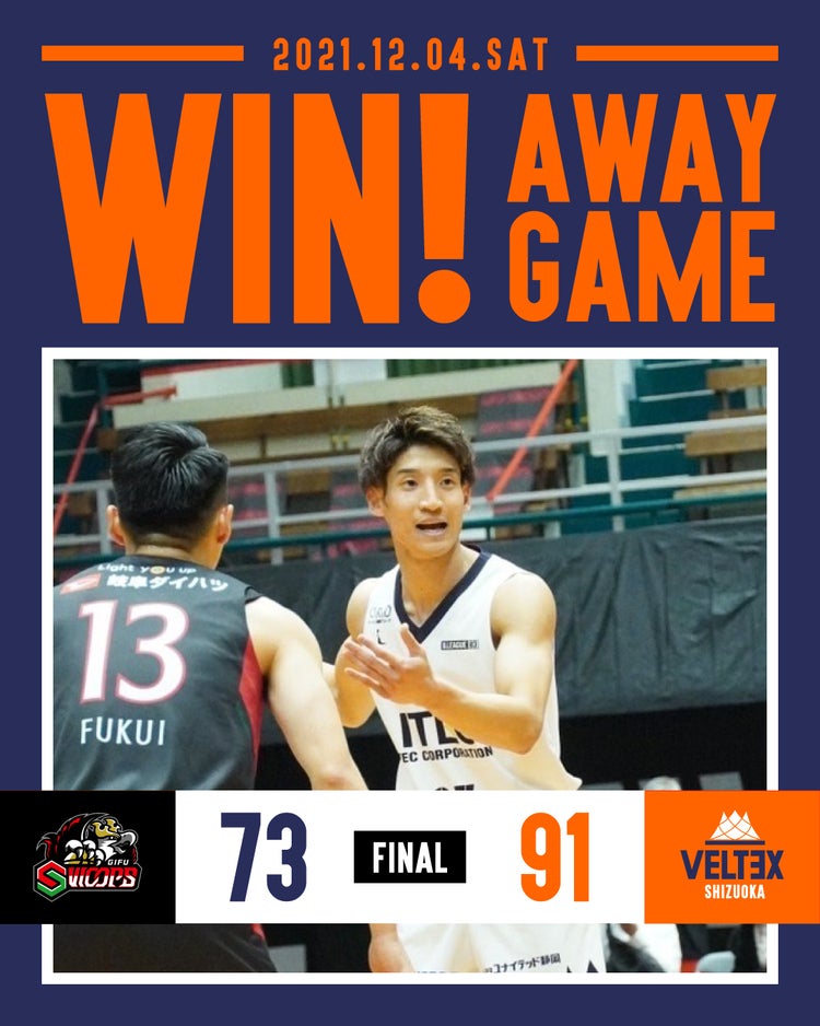 第4クォーター。岐阜#13福井が3本目のスリーポイント、#34ジェイスの得点で少しずつ点差を詰められそうになるも、静岡#7アレクシスがこのクォーターだけで14得点をマークし、全員が最後まで集中力を切らさず戦いきり、最終スコア、73-91で勝利を飾った。