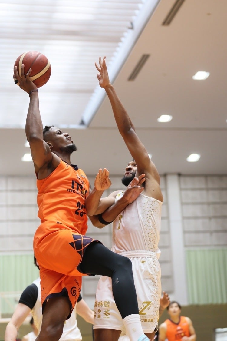 第2クォーター。#7アレクシスが開始早々鹿児島からスティール奪い、アグレッシブなディフェンスをみせる。#23ライアン、#25ダマがリング下で得点を積み重ねるも、得点能力の高い鹿児島は、#7クリスチャン、#23アンソニー、#58永山に連続ポイントを許し大きく点差を広げられ、34-43で前半を折り返す。