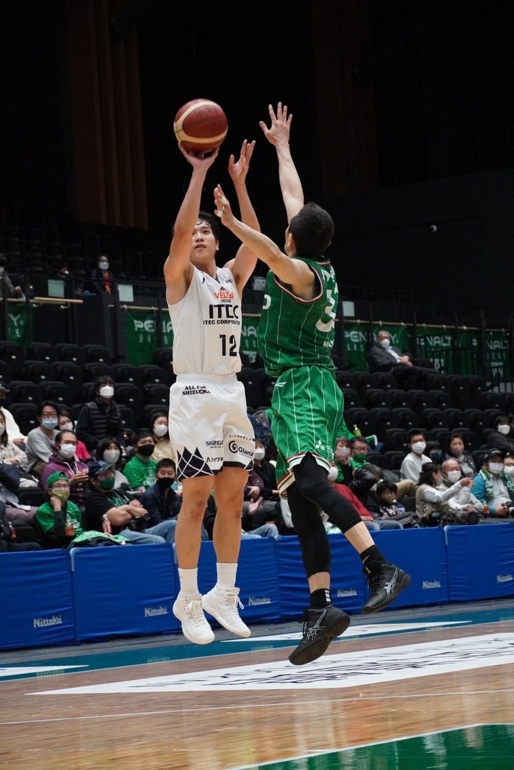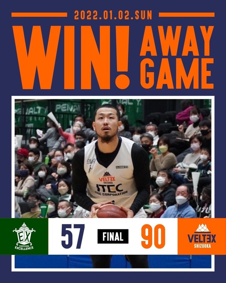 第4クォーター。開始直後、横浜#33宮田にスティールを許し、レイアップを決められ、流れが横浜に傾くかと思われたが、静岡#25ムッサがゴール下でバスケットカウント、ボーナスショットも決め3点プレーを成功。そこから静岡が流れを掴むと#6大友が2本の3Pシュートとドライブを決め、さらにリードを広げる。最後には静岡#1大石が技ありのレイアップを決め、最終スコア57-90で2022年初勝利を飾った。