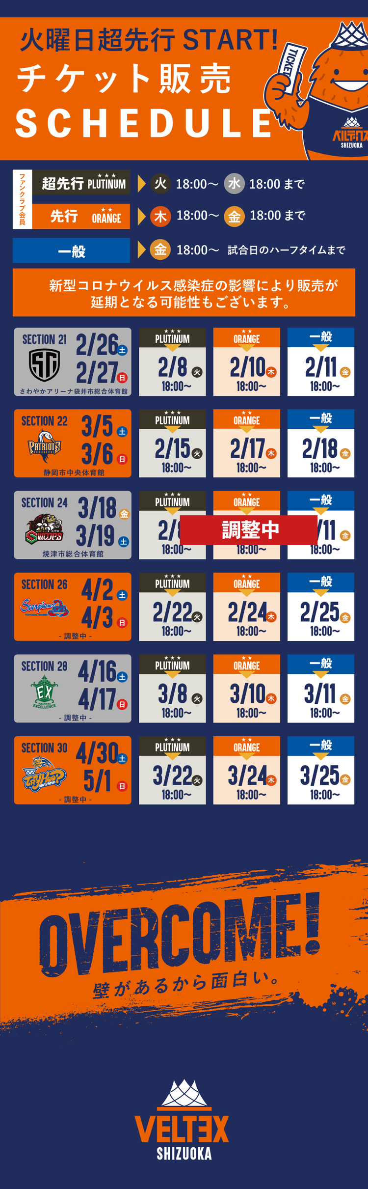 なお、販売対象座席や、座席数制限の有無については、新型コロナウイルス感染症の拡大状況などの社会情勢を注視し、開催地域の自治体や、B3リーグ、公益財団法人日本バスケットボール協会(JBA)の要請に応じ、販売前日までに決定の上お知らせいたします。