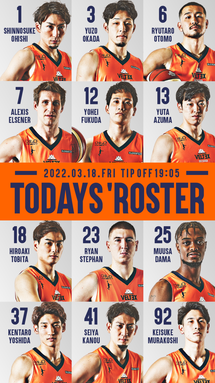 #1 大石慎之介、#3 岡田雄三、#6 大友隆太郎、#7 アレクシス・エールセネル、#12 福田陽平、#13 東祐太、#18 飛田浩明、#23 ライアン・ステファン、#25 ムッサ・ダマ、#37 吉田健太郎、#41 加納誠也、#92 村越圭佑