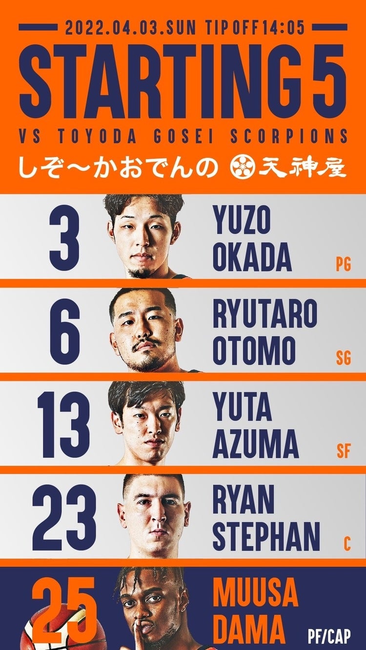 #3 岡田雄三、#6 大友隆太郎、#13 東祐太、#23 ライアン・ステファン、#25 ムッサ・ダマ