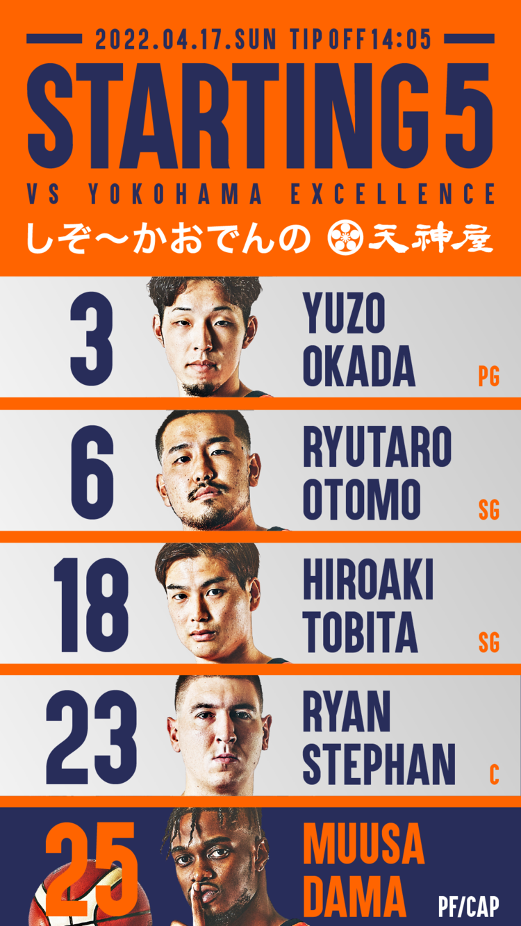 #3 岡田雄三、#6 大友隆太郎、#18 飛田浩明、#23 ライアン・ステファン、#25 ムッサ・ダマ