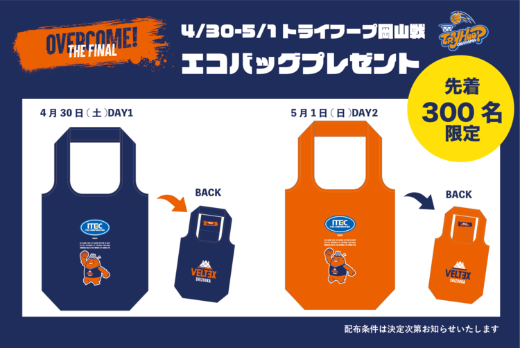 4/30-5/1トライフープ岡山戦来場者プレゼントはTシャツ&エコバッグ