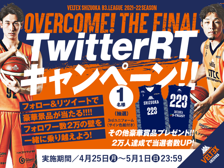 この度、ベルテックス静岡では本日より2021-22シーズン終了まで7日間「Twitterフォロー&RTキャンペーン」を実施します!今シーズンのスローガン「OVERCOME!」プロジェクトの目標にも掲げている公式SNS2万にフォロワーを達成すべく、また、このキャンペーンを機にぜひベルテックス静岡を知っていただければと思っております!
