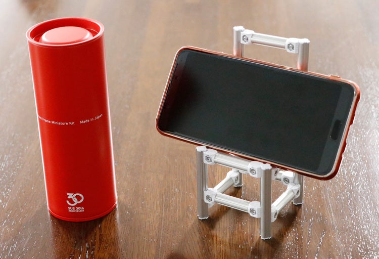 ▶アルミフレームメーカーSUS株式会社30周年を記念してつくられた「オリジナルスマホスタンド」。職場やご自宅でも大活躍すること間違いなし!