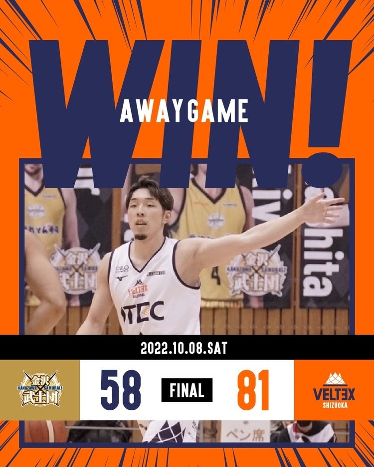 10月8日(土)、七尾総合市民体育館(石川県七尾市)でB3 LEAGUE REGULARSEASON 2022-23第2節DAY1が開催され、ベルテックス静岡は金沢武士団と対戦した。