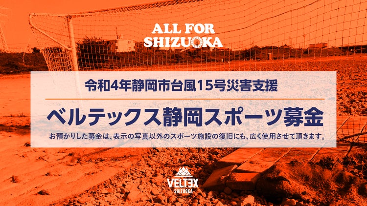 株式会社VELTEXスポーツエンタープライズ(代表取締役社長:松永康太)は、令和4年9月の台風15号により各所において甚大な被害が発生した静岡市内の現状について関係各所へのヒアリングをした結果、「スポーツで日本一ワクワクする街へ。」という企業理念に基づき、台風の被害を受けた公共スポーツ施設等を対象にその復旧を目的とした「ベルテックス静岡スポーツ募金」を下記の概要にて受け付けることといたしました。