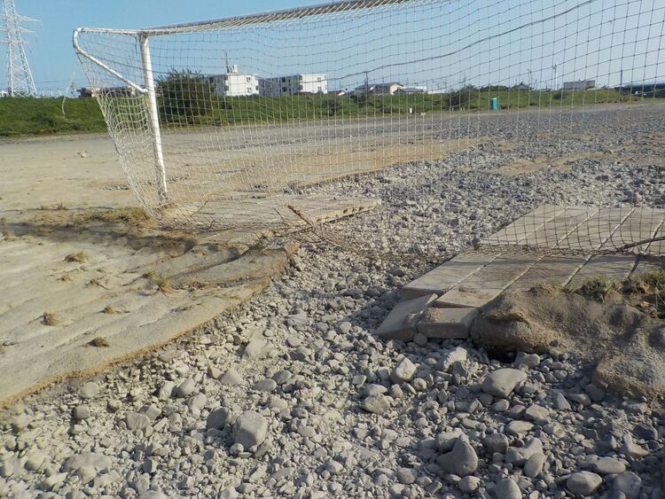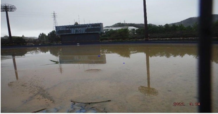 安倍川の氾濫により、グラウンドが冠水し、表面が削られた箇所が多数あるとともに工作物なども破損しました。
