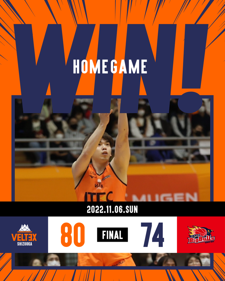 タイムアウトあけ、静岡#8新川が4本目のスリーポイントを沈めると、岩手#2石川がスリーポイントで返すなど、拮抗した展開が続いたが、ラストオフェンスで静岡#25ローソンがジャンプショットを決めきり最終スコア80-74、最後までリードを守り切った静岡が勝利を収め、チームは8連勝を記録、B3リーグ 1位に順位を上げた。