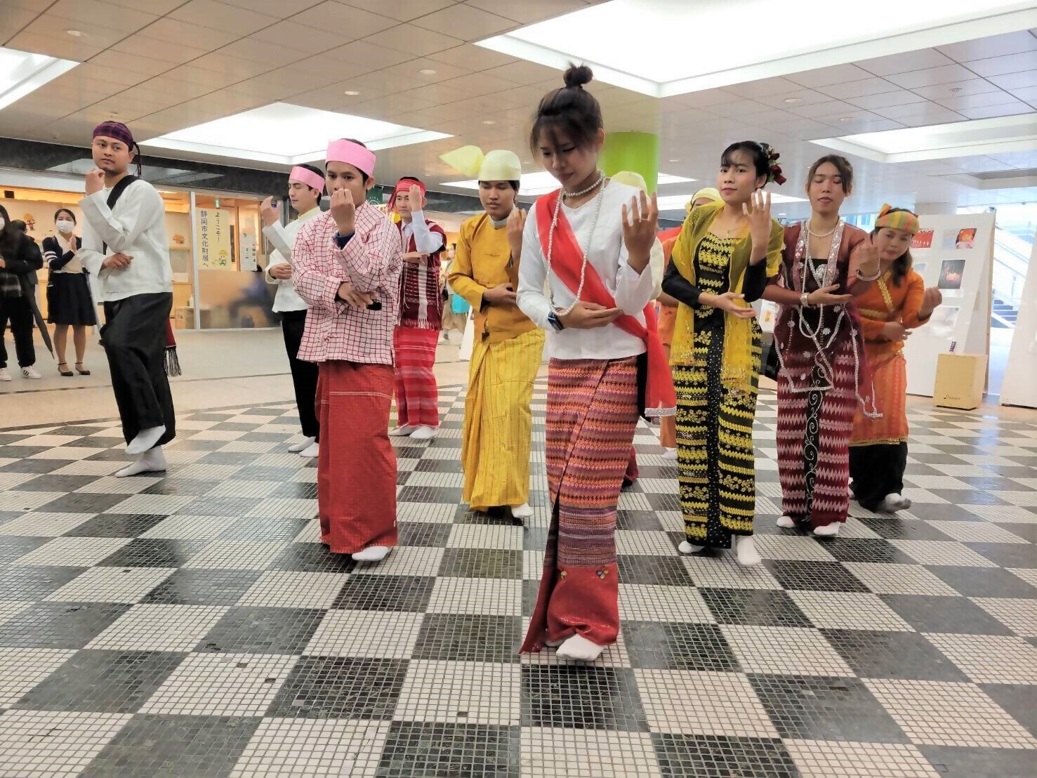 ミャンマーの文化の紹介や写真展などの活動をしています。ミャンマーには135の民族がいます。今日は8民族が衣装を着て踊りを披露します。わたしたちと一緒にベルテックス静岡を応援しましょう!