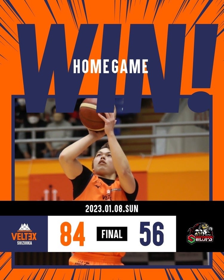 第4クォーター。ファーストオフェンスで静岡#37吉田がドライブを仕掛けファウルを誘い出しチームに勢いを与える。続く#7エールセネル、#8新川がスリーポイント沈めると、さらに#7エールセネルがドライブからアンドワンを奪う。その後も#41加納のスリーポイント、#92村越のドライブで得点を積み重ね最後まで攻撃の手を緩めることなく戦い、最終スコア84-56。2023年1発目のホームゲームを連勝で終え、チームは10連勝を記録した。