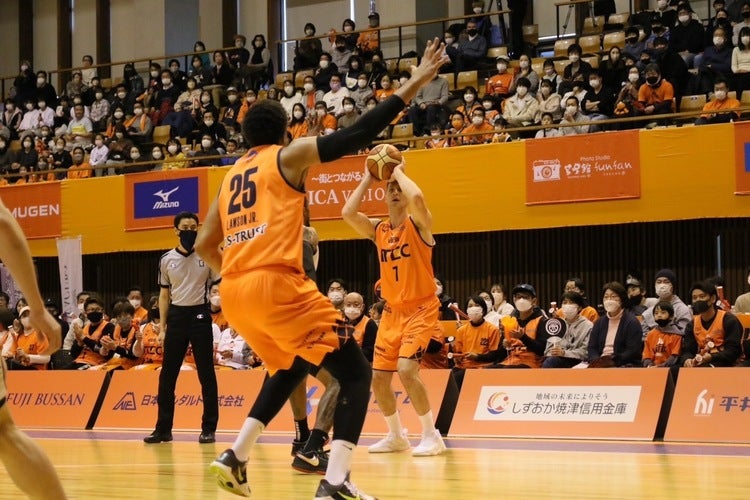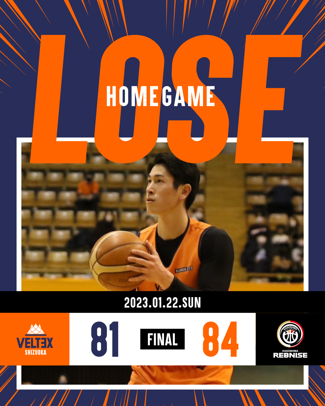 第4クォーター。鹿児島#1中島にスリーポイントを決められリードを奪われる。対する静岡は#37吉田が与えれたフリースローをきっちり2本決めると、続けて#17ミラーが得点をあげ、ここから膠着した時間が続く。3点ビハインドで迎えた残り1:13、静岡#3岡田のスリーポイントで同点に追いつくも、すぐさま鹿児島#15濱田にスリーポイントで返される。それでも静岡は最後まで攻め続け、残り7.5秒、#25ローソンがスリーポイントを沈めるも惜しくも届かず、最終スコア81-84で惜敗を喫した。