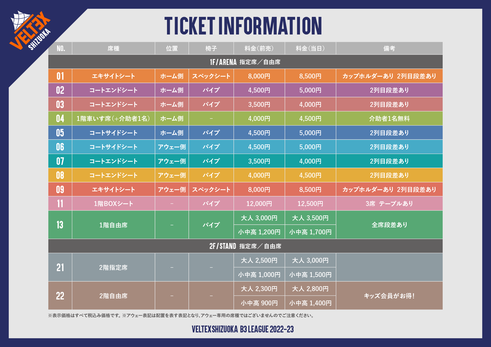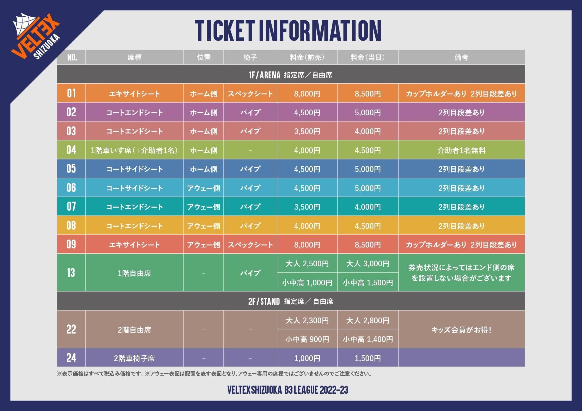 ホームゲーム開場時間の30分前より会場チケット売場にて2階自由席のみハーフタイム終了後まで販売