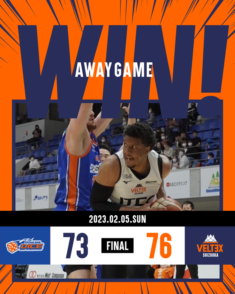 第4クォーター。開始から静岡が猛攻を仕掛ける。#7エールセネル、#17ミラーが立て続けにバスケットカウントアンドワンを奪い3点プレーを成功させ、一気にリードを広げる。ところが立川#32秋山に2本のスリーポイントを決められると、ここから立川に連続得点を許すなど、互いに譲らない拮抗した時間帯が続く。残り15.8秒、1点リードの静岡キャプテン#3岡田が意地を見せる。バスケットカウントアンドワンを奪い3点プレーを成功。追う立川は粘り強くファウルゲームに持ち込んでくるも静岡はフリースローをきっちり決め、73-76で辛くも勝利を収めた。