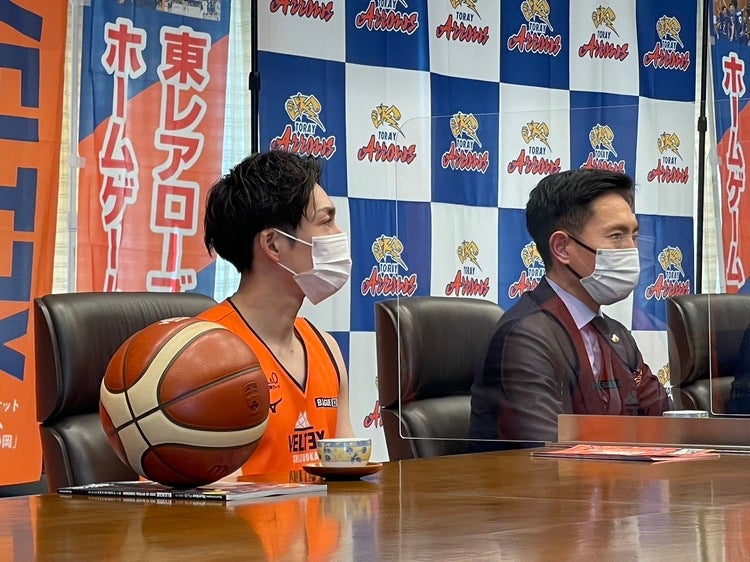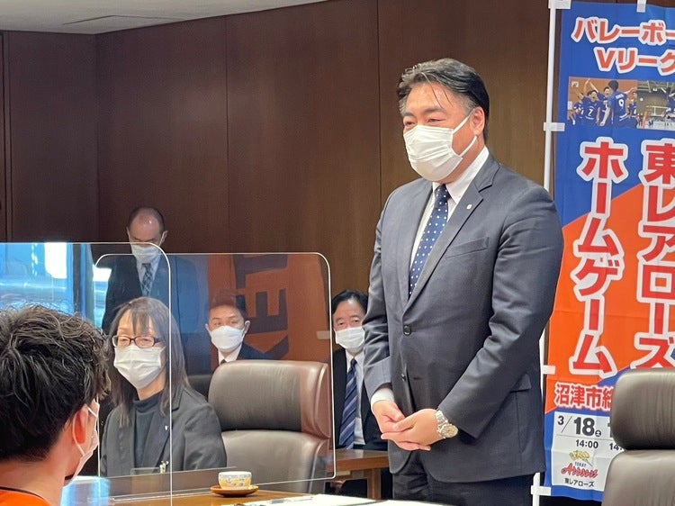 今回、表敬訪問に出席させていただいた、沼津市出身 背番号1番 大石慎之介 選手は「今回、他競技である東レアローズさんと沼津市を盛り上げていけることが凄く嬉しいです。僕にとって沼津市は生まれ育った街であり、とても愛着のある街です。僕が幼いころに旧市民体育館でプロ選手の試合を見て、将来プロ選手になりたいという夢を抱きました。今度は僕自身が静岡の子どもたちに夢を与えられるよう、そして何より試合を楽しんでいただけるよう戦いたいと思います。」と、お話させていただきました。