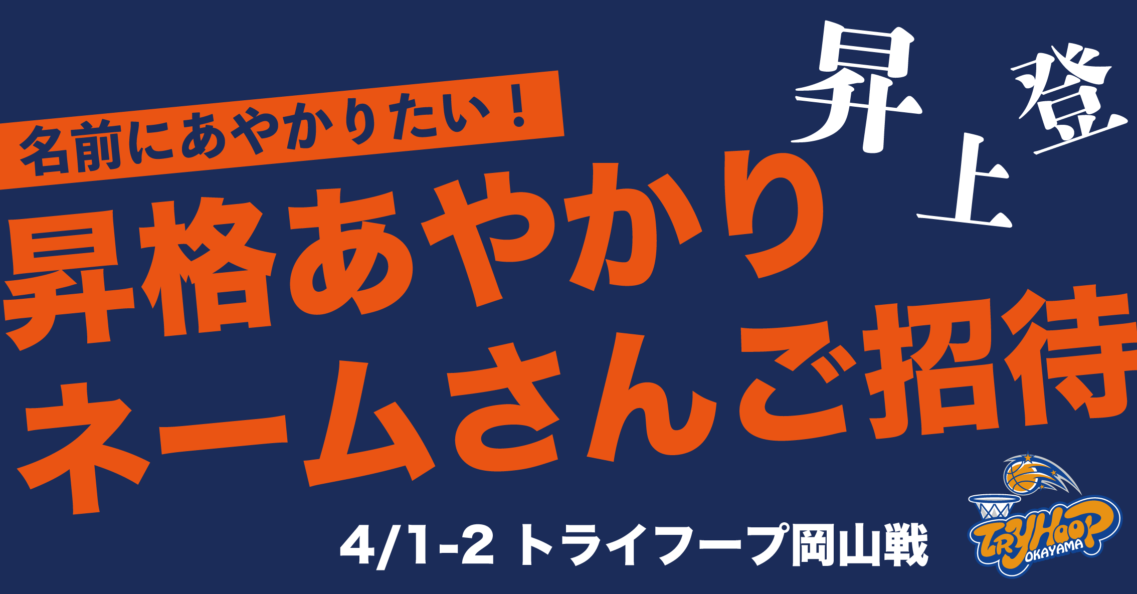 B2昇格を祈願して、ホームゲーム最終節 4月1日(土)2日(日)トライフープ岡山戦では「昇格」にちなんだ「昇」「登」「上」の漢字が名前に入っている方を2階自由席へご招待いたします。