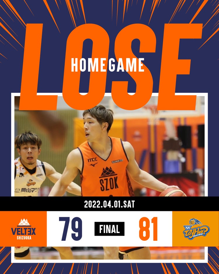 第4クォーター。岡山#16小堺に得点を許すも、静岡も#17ミラーがゴール下で得点を挙げ、拮抗した展開となる。残り6:18、試合が動く。静岡#3岡田のスリーポイントで同点に追いつく。するとここから静岡#17ミラーが3点プレーを含む連続9得点を挙げリードを広げる。ところが残り0.2秒、岡山#22向井のフリースローで逆転を許し、最終スコア79-81で惜しくも敗れた。