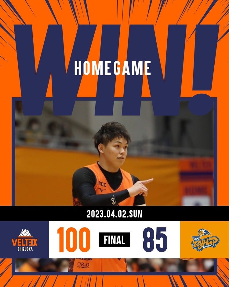 第4クォーター。早々に岡山#22向井のスリーポイントを許すが、静岡#17ミラーがインサイドで踏ん張り、リードを守る。その後、チームファウルがたまり、与えられたボーナスフリースローもきっちりと決め続け、最終スコア100-85でレギュラーシーズンホーム最終戦を見事勝利をおさめた。この試合で、#3岡田が24得点、#7エールセネルが22得点、#0山田が20得点と3選手が20点越えのスコアを記録した。