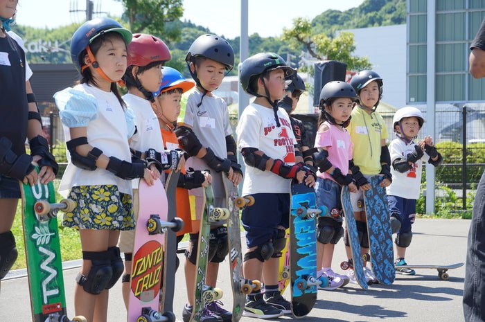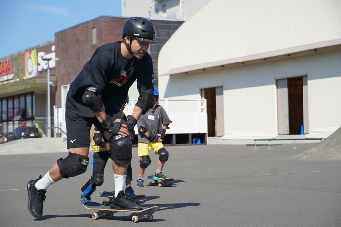 スケボーの乗り方、漕ぎ出し方など、一つ一つの動作を丁寧に指導。それでも初めてスケボーに触った子は、恐怖心がある様子でした。徐々に慣れてくると最後には少しの距離であれば乗ることができる子もおり、スケボーの楽しさを実感していました。