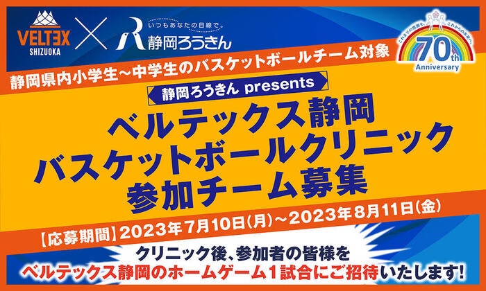 〈静岡ろうきん〉は「地域」に対する社会貢献活動の一環として、静岡を拠点に活動する 男子プロバスケットボールチーム(B2.LEAGUE)「ベルテックス静岡」に協賛し、2023-24シーズンもサポートパートナーを継続して締結しました。この協賛に伴い、静岡県内のバスケットボールチームを対象に、バスケットボールクリニックを開催いたします。プロ選手から直接指導を受けことが出来る機会となりますので、奮ってご応募ください。