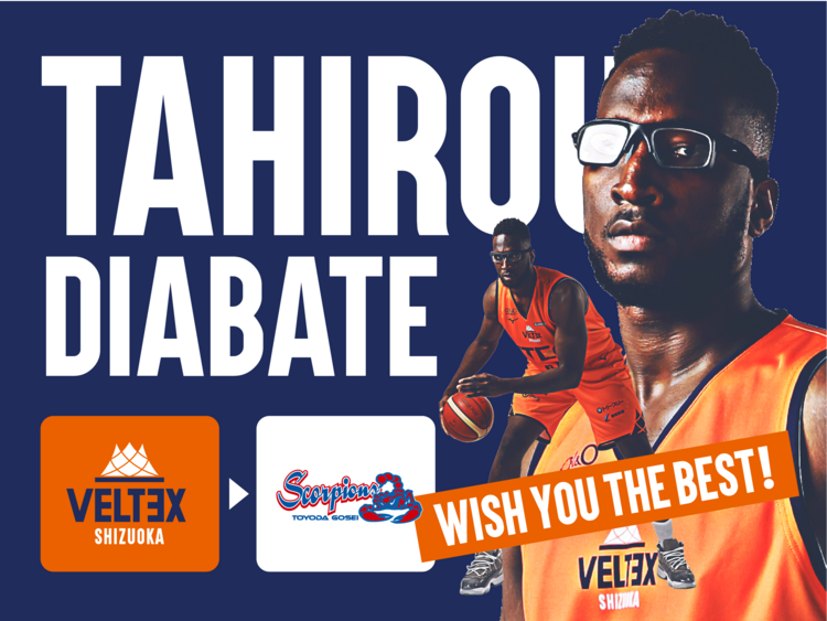 このたび、5月15日付けでB.LEAGUE自由交渉選手リストへ公示されておりました #24 タヒロウ・ディアバテ 選手が豊田合成スコーピオンズ(B3リーグ)へ移籍することが決まりましたのでお知らせします。