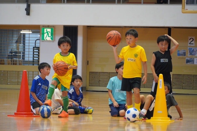 ▲シャッフルクリニックで、バスケットとサッカーのドリブルをミックスしたトレーニングに取り組む子どもたち。