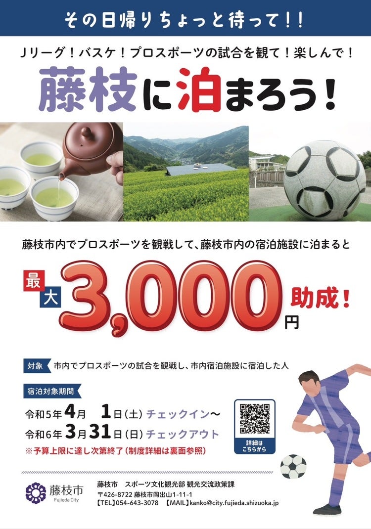 「もっとJリーグ、Bリーグなどの試合に足を運んでもらいたい」「もっと藤枝市内を観光してほしい」藤枝市のそのような思いから、令和5年度に新な制度を創設しました。藤枝市で行われるプロスポーツの試合を観戦した人が市内宿泊施設に泊まると、最大3,000円の助成を受けられます。ぜひ活用し、藤枝を満喫してください!