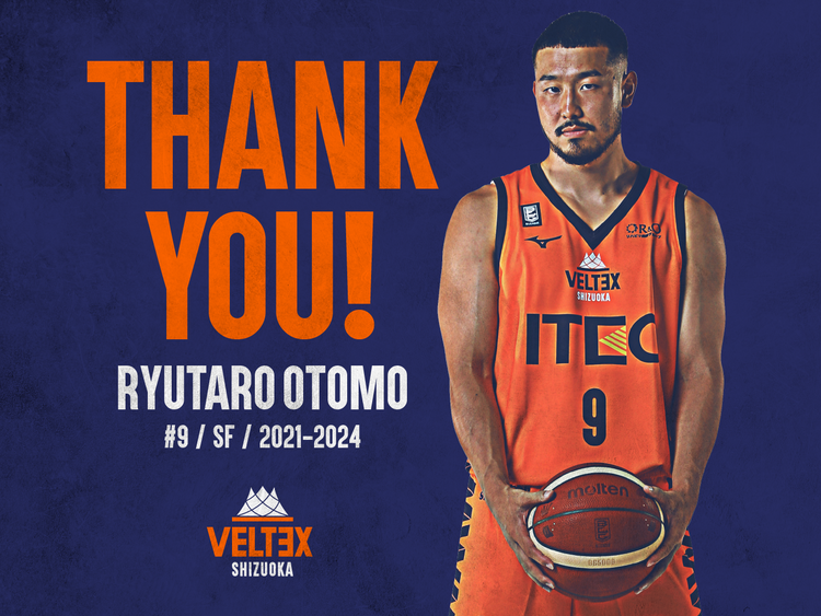 この度、ベルテックス静岡では #9 大友隆太郎 選手との契約が満了となり、本日5月10日(金)15:00にてB.LEAGUE自由交渉選手リストへ公示することとなりましたのでお知らせします。
